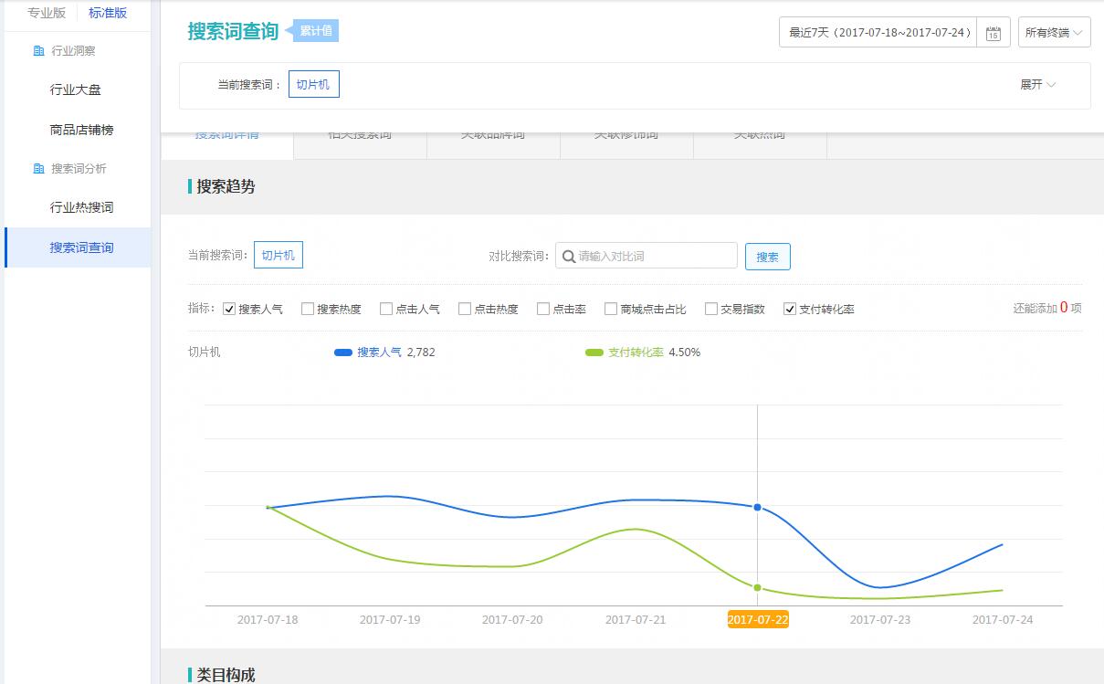 大家在选好产品之后,首先要去做的不是作图、上新,而是去数据分析。最简单的方法要去看两个数据,一是宝贝数、而是搜索指数。今天我们以我们分析出来的切片机举例,看下面数据: