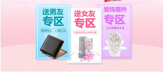 如图10将活动分为了送男友专区、送女友专区和装饰摆件专区,很清晰的例举出了不同的专区,方便客户对想要的产品进行选择购买。可以说很贴心的考虑到了客户的购买心理。