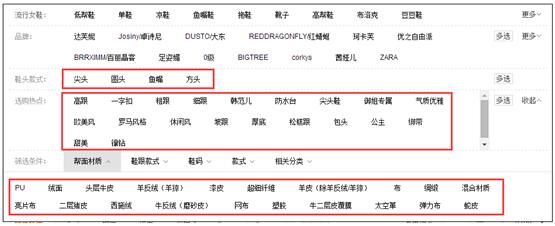 你自己要根据你对这个行业的属性程度,提前选好几个维度,比如今年流行什么材质的,流行什么样子鞋跟的,流行什么风格的(选购热点),那么材质、鞋跟款式、选购热点,就是重点维度。你就从头看这些宝贝,分别是什么,比如我上面的例子当中就是:PU材质、粗跟高跟的、流行元素有(浅口、坡跟、皮带扣)。你把这些记录下来,统计一下前两页的宝贝(PC端),然后你看看哪一种属性值出现的频率高,比如,浅口的、粗跟的、一字扣的,出现的概率都很高。那么你就去选款吧,具备这些元素的产品,爆的几率就要高很多。